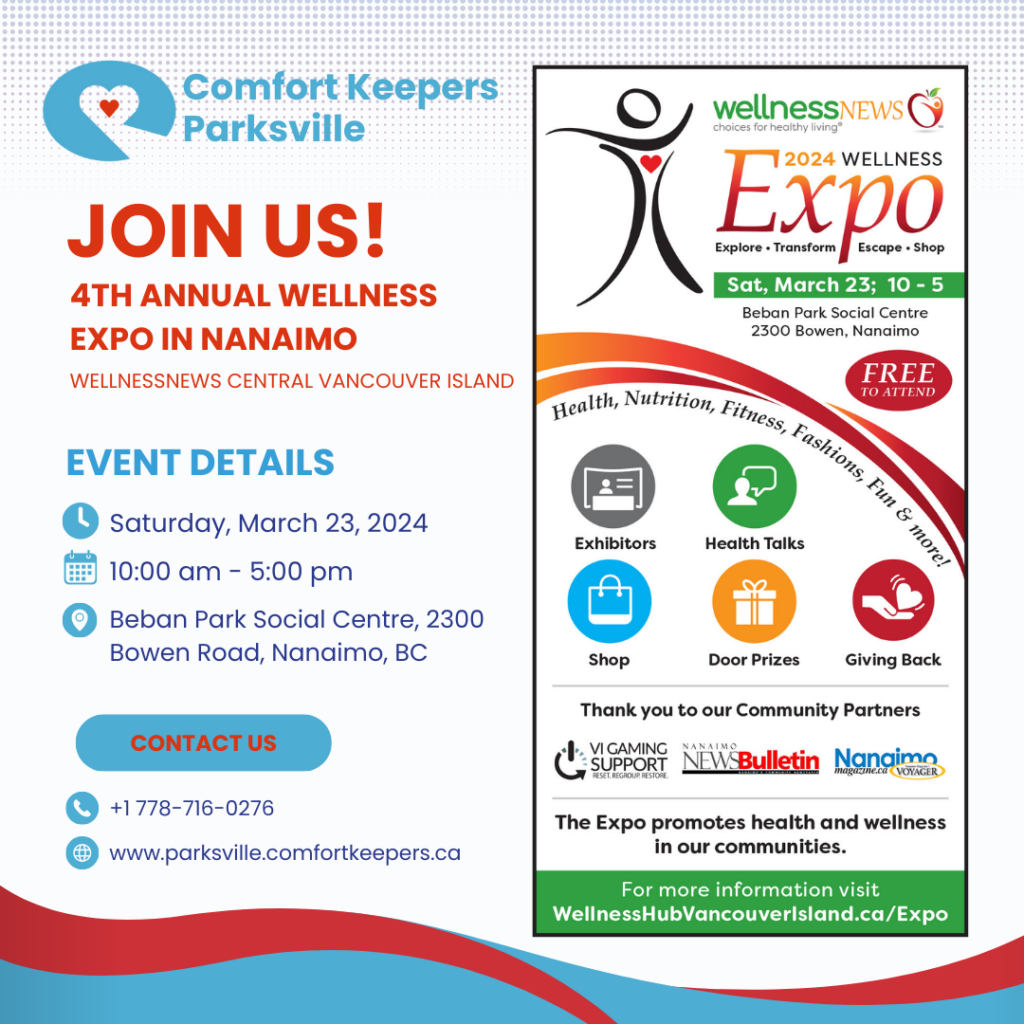 Join us at the 4th Annual Wellness Expo on March 23, 2024, in Nanaimo, BC, where Comfort Keepers Parksville will proudly present our comprehensive senior care services. Hosted by Wellnessnews Central Vancouver Island, this event promises a day filled with wellness talks, exhibitors, and exciting door prizes.