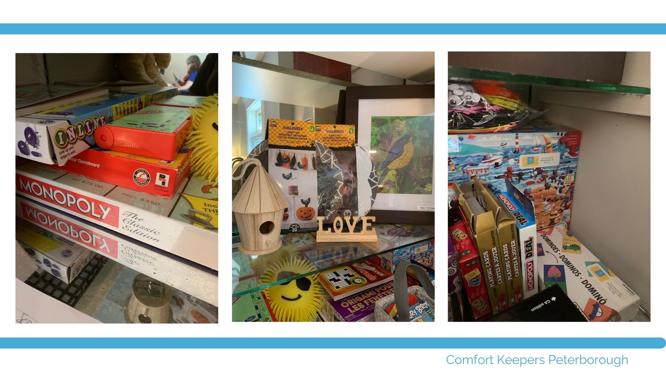 To bring more fun and joy into the lives of our senior clients, Comfort Keepers Peterborough has established a new Activity Corner stocked with games, seasonal items, craft supplies, books, and more. We are always looking for ways to connect with our clients and enrich their quality of life. We know from experience that in-person companionship is an important part of a senior’s wellbeing.